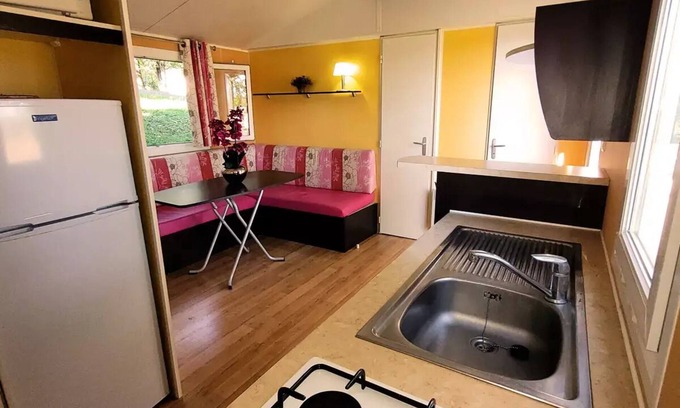 Details: City center access : 1300 m Wi-Fi access : free on all camping Playground for children Family animations : varied throughout the season Deposit of bread : & pastries (high season only) Grocery store : troubleshooting in partnership with local producers Laundromat : rates and on-site settlement Bedding : Disposable - 10€/bed (single) and 12€/bed (double) - upon reservation and subject to availability - to be paid on site Final cleaning : optional - 60€/rent - to be paid on site Mini golf Animation level : 63 Number of stars : 4 Water park : large outdoor swimming pool – toboggans 70m - open from the end of June to September - with free access to opening hours (For safety reasons, the burkini is not accepted within the aquatic area ) Car park : 1 place/location Sin : on site at the Camping thanks to the lake bowling Ping Pong Indoor swimming pool : heated - open all season - free access to opening hours (please consult on site) Near airport : Toulouse-Blagnac Airport #TLS (70.1 km) Restaurant : Street Food & Cold Buffet - open in high season only Spa : with sauna / massage or aromatherapy session - see rates and on-site regulations Tourist tax (surcharge) : €0.86/day/person over 18 (subject to change) - to be paid on site Multisports ground : (football, basketball, hand) - fitness & crossfit – tennis court – beach volleyball court Pets Allowed : 3€/night - 1 animal per accommodation - up-to-date vaccination records to be presented - 1st and 2nd category dogs prohibited - to be paid on site Deposit (in euros) : 280 Number of bedrooms : 2 Number of double bed : 1 Number of single beds : 2 Number of pieces : 3 Number of toilets : 1 Number of bathroom : 1 Cooking plate Fridge Surface (m²) : 30 Dishes and cutlery
