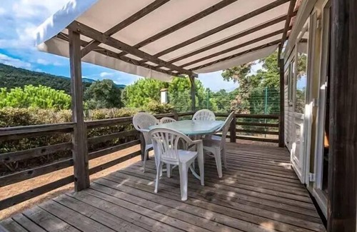 The accommodation includes: - Room 1 : Double bed (140 x 190 cm) or (160 x 190 cm)- Room 2 : 2 single beds (80 x 190 cm)- Living / cooking area : Banquet, Kettle, Electric coffee maker (filter), Fitted kitchen, Sink, Microwave, 4 gas hob, Fridge with freezer, Table and chairs- Bathroom : Shower and Washbasin- Toilets : WC (independent or in the bathroom)- Private Terrace : Partly or totally covered, wooden terrace on high, garden furniture (table and chairs)The composition of the accommodation may vary according to its vintage. The fifth bed can be found either in the children's room (a bunk bed suitable for children over 6 years of age) or in the living area (convertible bench for children under 15 years of age).