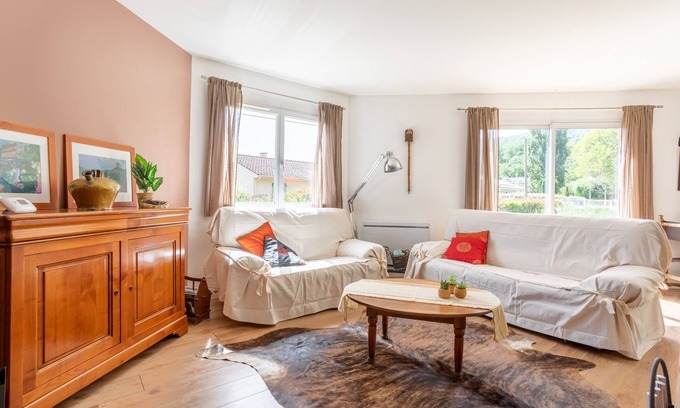 - A bright living room of 30 m² with TV, sofas and dining area.