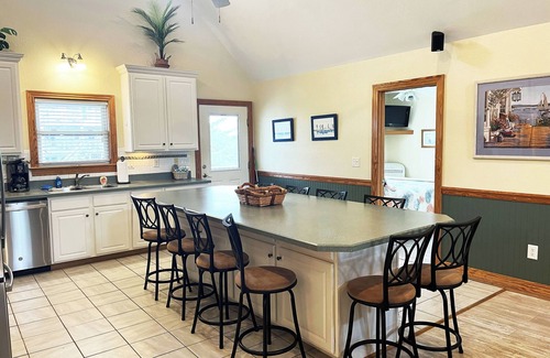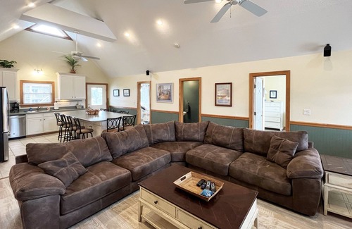 The spacious living area features cathedral ceilings, a cozy wood-burning fireplace, and an open layout that flows into a modern, fully equipped kitchen. There’s a wet bar for easy entertaining and a large island with seating for ten, ideal for family meals or casual hangouts.