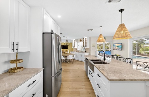 Inside, you'll find a beautifully designed open-concept layout filled with natural light, coastal-inspired finishes, and all the modern comforts of home. The chef's kitchen flows seamlessly into the living and dining areas, making entertaining a breeze. Three spacious bedrooms offer plush accommodations for the whole family or a group of friends.