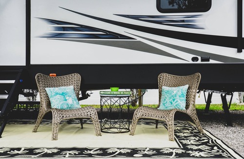 The trailer is fully equipped with everything you will need to be comfortable, relax, and enjoy your time away from home. It has a kind size bed in the master bedroom. A beautiful well lit kitchen with a farmhouse sink, double refrigerator, oven, stove top, and microwave. The kitchen is fully stocked with everything you need to prepare and enjoy your meals. The living room has dual recliners to lounge back in and enjoy a good book, watch tv, or warmup by the fire place. The living room also has a love seat that becomes a pull out bed for additional sleeping (this bed is about the size of a double bed).