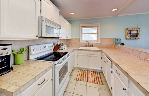 The open-concept kitchen comes fully equipped with dishes, cookware, microwave, refrigerator, stove/oven, etc. Everything you need to make a quick lunch or five-course meal. Don’t feel like cooking? Visit some of our local favorite places, from the café down the street to the numerous restaurants on The Strand and Seawall of Galveston.