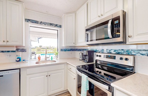 This pleasant canal-front home beautifully blends modern amenities with coastal charm. The spacious outdoor living area highlights a private, heated pool with chairs and towels included and views of the water just beyond the backyard. Grill up your catch of the day and relish in the stunning scenery. Or use direct access to the living area and well-equipped kitchen to gather for meals and board game night. The open-concept, light-filled interior makes this home feel extra luxurious and comfortable. After a fun day of beach adventures, relax on the waterfront patio with a glass of wine, retreat to a plush, cozy bedroom to stream your favorite movies, and prepare for another day of making timeless memories.