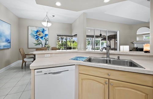 This newly available, beautifully decorated 2,700+ sq. ft. private pool/spa home is just 1.8 miles from Nokomis Public Beach and perfect for a relaxing vacation. With two king bedrooms and one queen bedroom, the home accommodates up to six adults, ideal for three couples. The spacious, split-floor plan includes a large master suite with direct access to the private saltwater pool and spa, which is enclosed in a screened lanai. The master suite also features a luxurious en-suite bath with a soaking tub and dual showerheads. The other two bedrooms are located on the opposite side of the home, ensuring privacy for all guests.