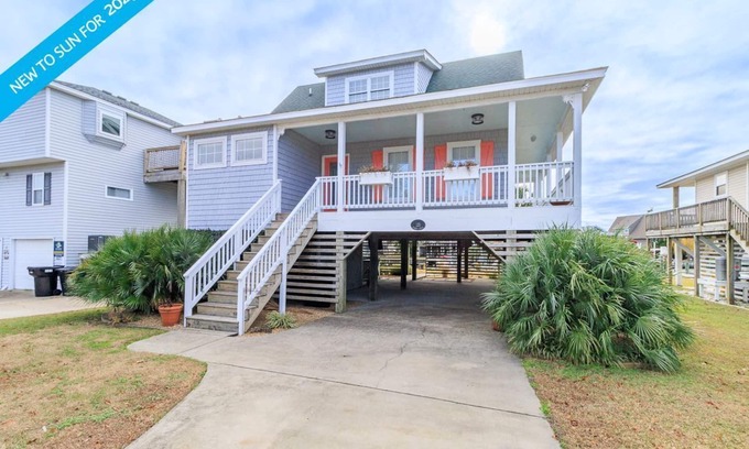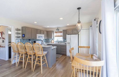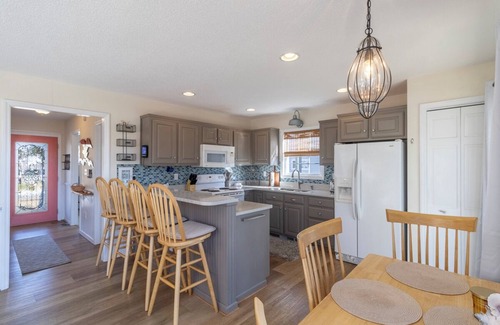 Wide, wraparound decks invite you up the front stairs with cheery, colorful touches on the exterior of the home. As you enter, you’ll experience the thoughtful and charming coastal décor and open floorplan suitable for enjoying family togetherness. The main level includes a well-appointed eat-in kitchen with seating for 4, plus 4 counter height barstools, and access to the sunroom for the ultimate in relaxation and serenity.