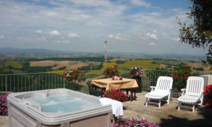 We just rent one apartment, shown by the pictures; in this way our guests have complete privacy both for the garden & the terrace with Jacuzzi. Ideally located in the centre of Umbrian region. Within 15 minuts by car you can reach many interesting places like Assisi, Perugia, Todi, Montefalco, Todi...and many other small villages where to enjoy the tradions of architecture, religion, food, wine and craftsmanship.Our farmhouse, enjoys a wonderfull view over the river Tiber valley and over the rolling hills of Perugia. Our Jacuzzi, perfect to refresh during summer and relax, is set on the huge balcony where the view is breathtaking especially at sunset. Jacuzzi pool open from the beginning of June, till the end of September.