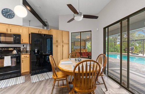 Our home is designed for comfort and relaxation with an open floor plan that creates a seamless flow. The spacious living areas wrap around the kitchen, leading to a large lanai, an outdoor dining area, and a heated pool. The home offers a private and peaceful retreat near the 7th tee of Oak Hills Golf Club.