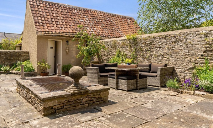 Candlemaker's Cottage has a fabulous, south-facing courtyard and garden. In the late spring and summer, this really is the property's centrepiece - when the pergola's roses and clematis are in full bloom and the lavender bed is buzzing with bees and giving off a heady aroma. The courtyard has a raised central pond (with safety cover) from where the sound of bubbling water can be heard. Guests are provided with an outdoor seating set with two sofas, four stools, a table, and a brick-built charcoal BBQ. The courtyard leads to a gate through which is a well (covered) and a fully enclosed lawn with a lavender bed, pretty borders, a bench, and a hidden seating area behind the Garden Room.