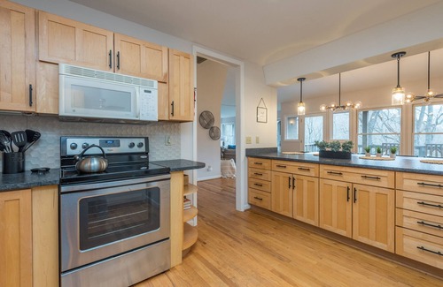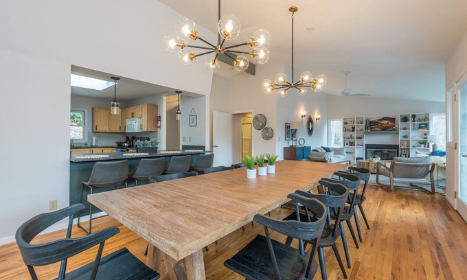 Main Level- open living, dining, and kitchen areas; living room with wood-burning fireplace; dining with table and seating for 10, along with kitchen bar with seating for 4; full kitchen with all basic amenities, including dishwasher and standard coffee maker; master bedroom with a king bed, a Smart TV (streaming only, no cable), and full bathroom.
