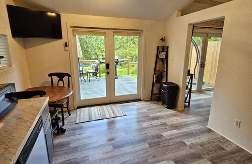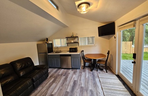 This cozy cabin is freshly renovated. The bedroom is outfitted with a queen bed, dresser, coffee station and a bar to hang a few clothes on. The ductless heating and AC will keep you comfortable no matter what season you are visiting. In the main room there is a tv, a few books & games, high speed fiber internet for video streaming or work.