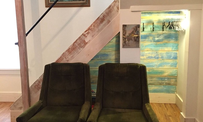 Downstairs is a fully stocked kitchen complete with zinc countertops and a neon ice cream sign. Bathroom with Shower, full size washer dryer, living room large screen Smart TV with internet service and a Dining area.