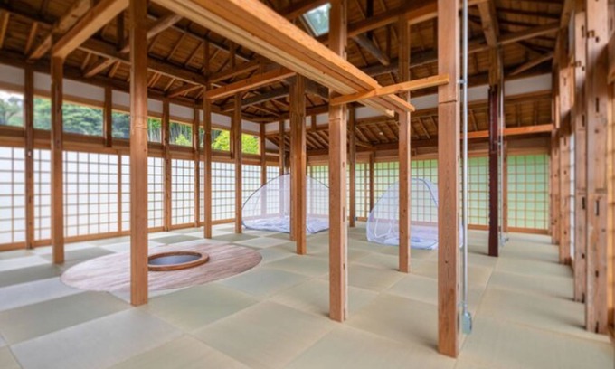 With the hearth in the middle the bright and spacious space is open with 58 tatami mats that are custommade without edge It can be used for large families small groups training sessions etc