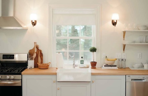 Inside, the suite is thoughtfully designed in a transitional style, blending timeless elements with clean, understated finishes. There’s a king bed, pull-out sofa, full kitchen with gas range and dishwasher, in-unit washer/dryer, and a dedicated desk area. Skylights and large windows bring in natural light, and the space is styled to feel simple, clean, and welcoming.