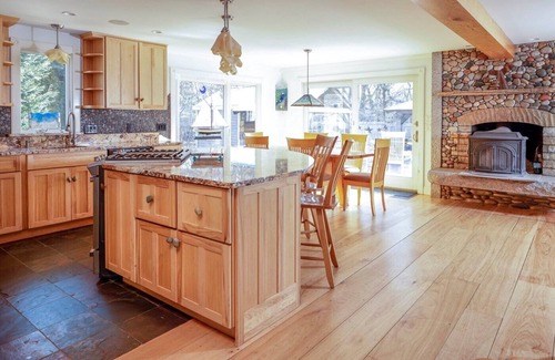 Imagine yourself immersed in the pure relaxation provided by the solitude of the private heated salt pure pool while sipping on a frozen delight delivered to you from the adjoining outdoor bar. Your dinner is sizzling on the grill or griddle of the plush outdoor kitchen. Your friends and family are quietly reading under the pergola while gently swinging in the cozy sky chairs. The outdoor fireplace emits a warming glow from the crackling fire. This and more are all possible from this custom built home which is only to be outdone by the unique and exquisite yard, ideal for entertaining your entire party. The main floor of this home encompasses a sitting space with 65'' TV, a dining table with 8 chairs, a spacious kitchen with island seating, and a half bathroom with direct access to the private enclosed outdoor shower. On the second floor you will find the laundry room and the primary bedroom with a king bed. Just outside the primary bedroom find a room with two sets of bunk beds (4 twin mattresses) and another bedroom with a queen. The second floor is rounded out by the cavernous bathroom complete with a clawfoot tub and a walk-in shower. There is driveway parking for 4 cars. Need a little additional space? Consider the adjoining rentals adding 3-4 more bedrooms and 2 additional kitchens! Home available for 3 night minimums with an added cleaning fee. Additional $250 per dog per week fee applies (not permitted in pool area) Please note: pool use is seasonal, not guaranteed outside peak summer months, and subject to routine testing and maintenance; spa availability, where offered, follows the same policy. Non-refundable $250.00 fee (includes administrative fee and damage waiver assurance) Fee plus applicable state and local taxes. Linens not provided. Guests may rent linens or bring their own.