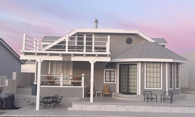 The house is located in a gated community on canals that lead out to the Colorado river. It is nicely located just off the main canal making for easy access to the river. The canals are 5 mph which makes for safe mooring of your boats and PWCs. It also makes for safe swimming or floating on rafts. The house has it's own private 50' dock right in front of the house. There are 2 levels of patio area. The main patio is at the water level. The second patio is off the second floor. The view from the second floor is towards the mountains and the large water area of the main canal where it forks. The house faces East giving it the advantage of afternoon shade during the hottest part of the day, but sun worshipers can still get the sun on the upper patio. This house is located right across the canal from my other house (The Pointe) making for a great set up for larger groups.