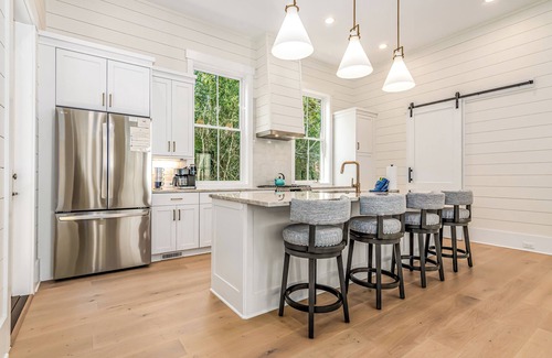 Discover this stunning new home in Cape Fear Station! With four bedrooms and four and a half baths, the open concept downstairs showcases an upgraded kitchen and appliances. Enjoy family dinners at the large dining table or unwind in the spacious living room. The master king bedroom downstairs features a private bath with a tiled shower. Upstairs, find three more king bedrooms, each with their own bath. Kids will love the loft with a day bed and trundle. Relax on the screened-in porch with forest views or explore the island in provided golf carts. Don't miss out on this beautiful home!