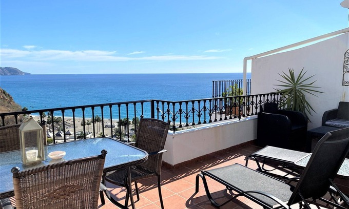 Capistrano Playa is a picturesque urbanization with typical Andalusian style houses surrounding an ornamental lake with plants and fish. It is located on the top of a hill, so it enjoys wonderful views of the sea and Burriana beach from a privileged position. The apartment is a short walk from Burriana Beach, where you can get there by a path and stairs that go through the pretty gardens. The urbanization also has 3 pools of different depths and the entire complex is closed to non-residents. Restaurants and other services are nearby and the center of Nerja is about 20 minutes away on foot, although there is a bus stop on the same street.