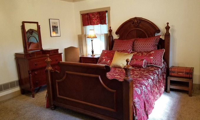 Enjoy staying in a private bedroom on a wooded hillside overlooking trees and a pond just 18 minutes from Churchill Downs. Private entrance to your bedroom and private bath. Experience a taste of Kentucky with a hot gourmet breakfast on weekends served on the wide front porch or eat in the log living room decorated with antiques and a massive fireplace. Continental breakfast is served on weekdays. Take a quiet break after a hectic day at the track with a walk along the creek. Take in the beautiful flower garden throughout the changing seasons. Finish a perfect day with homemade bourbon balls.