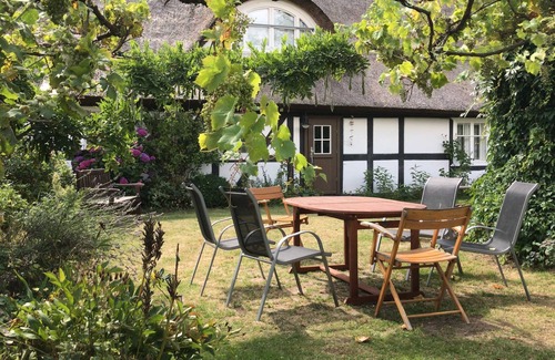 The "old fishery", a historic thatched roof house, with the 3 non-smoking holiday apartments "Kapitänstube", "Heimathafen" and "Fischerkoje" dates in part from the 17th Century and is a listed building. It was completely renovated and modernized in 1997. The associated “trap house” could not be saved and was rebuilt. Both buildings are provided with a thatched roof, a typical roof covering. The owner of this collector's item has tried to take the history, charm and charisma of this house into consideration, even if this means that some modern achievements are missing. All apartments are comfortably and extensively equipped so that guests can feel at home. The houses are surrounded by a park-like, near-natural garden with old trees and spacious lawns. The property is centrally but quietly located in the center of Bodstedt on the south coast of the Bodden of the same name. Equipment: non-smoking, compact stereo system with radio and CD player, television, free internet via W-LAN, shoe drip tray and cloakroom in the entrance area of each apartment.All beds have a size of 90x200cm double beds with single mattresses 90x200cm mosquito screens on the windows of the bedrooms , foldable luggage benches laundry package to be booked, baby equipment (travel cot, high chair ...) on request digital safe (except "captain's room") in the bedroom closet, light wooden floors, blackout curtains, additional blankets and pillows for indoor use, small selection of toys and books for everyone Old, designed brochures, magazines and guidebooks extensive kitchen equipment on cooking and food preparation equipment with mixer / kneader, baking molds and utensils as well as cooking and baking books stove, oven, microwave, refrigerator with freezer and Dishwasher ironing board and a steam iron cleaning equipment such as Vacuum cleaner, broom, hand brush, feather duster, cloth and cleaning agent (cleaning cabinet) Shopping basket First aid case for minor ailments Washing machine (each in the bathroom "home port" and "captain's room") Bathroom equipment with hairdryer, towel hook and bathtub and / or Shower cabin, window The garden of the old fishery is open to all guests and with 3000m2 is big enough for all guests. direct access to the garden (except "Fischerkoje" in the 1st OG) 1 seat with furniture and beach chair per apartment grill grate with fireplace in the back garden shed for brought leisure equipment for games and sports children's play area with swings, sandpit and slide, children's house bike stand covered, 1 car parking space per apartment