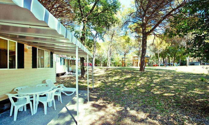 Great location: caravan park in the wooded area of a fifty hectare natural park on the Grado lagoon. Each of the practically furnished mobile homes has its own parking space. Young and old can refresh themselves in the 300 square meter pool, with the water slide providing the fun factor. If you prefer to swim in the sea, you can easily reach the lagoon's flat sandy beach via a pedestrian crossing. Depending on the location of your accommodation, the beach is between three hundred and five hundred meters away. There is a separate section of beach for dogs and their owners. The approximately 500,000 square meter natural park borders directly on the gently sloping sandy beach (reserved exclusively for park guests) and is only five kilometers from Grado's old town. You can easily reach the lagoon city by car via a causeway. Countless shops, restaurants and bars await you in the beautiful pedestrian zone. The following applies to the system: - 185 residential units - Reception - Restaurant - Pizzeria - Supermarket - Bar - Washing machine (for a fee) - Tumble dryer (for a fee) Activities nearby: A well-signposted cycle path runs directly past the complex, so you can explore your surroundings from a different perspective at a slower pace. Nearby is the famous archaeological site of Aquileia, which you should definitely visit. The place was one of the most important cities of the Roman Empire and is one of the largest archaeological sites in Italy. Amateur ornithologists get their money's worth in the Valle Cavanata and Foci dell'Isonzo nature reserves. A day trip to nearby Venice is also possible; it's best to take the train there; You can reach the lagoon city in about an hour and a half and have no parking problems. Other destinations for day trips are Trieste, Udine, Pordenone, Cividale and Gorizia Mobility: Not suitable for people with a