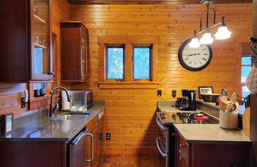 Cardinal’s Cove offers functional two-story living that's ideal for a true mountain getaway. This economical cabin experience is a great motel alternative and comes complete with rocking chairs and a cozy wood-burning fireplace. Venture out into the exterior covered stairs for funky private access to the lower level King bedroom. A queen sleeper sofa on the main level provides a second sleeping area, and a full bath on each floor makes for a practical stay. After a fun-filled day exploring the local surroundings, a soak in the jetted tub will relax you for a good night's rest in the king-sized bed. Wake up and find your new favorite place to be among the trees enjoying the simplicity of Cardinal’s Cove! This vacation rental is located in Black Mountain and is approximately 19 minutes to downtown Asheville.