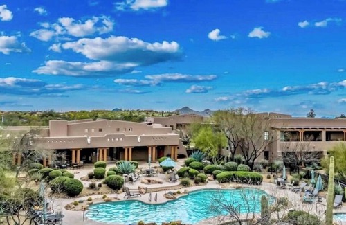 Unique 1B suite with two patios, and a compact kitchenette. On-site, guests can swim in the large, heated pool, relax in the spa, enjoy the clubhouse, or have fun on the putting green. Amazing views of Black Mountain and Pinnacle Peak.