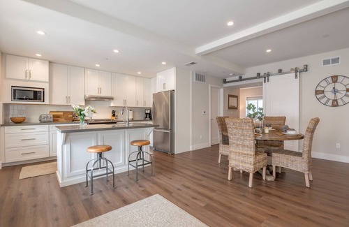 Carmel-By-The Sea this luxurious Home consists of 2 Vacation rentals. Each vacation rental consists of 1300 square feet of living space with two king bedrooms and en suite granite baths. OUR VACATION RENTAL IS PROFESSIONAL CLEANED WITH YOUR HEALTH IN MIND. WE LEAVE PLENTY OF PAPER PRODUCTS, HAND SANITIZER AND HAND SOAP FOR YOUR PERSONAL USE. Each vacation rental is the entire floor. Some guests prefer the second floor while others prefer the first floor. It's stunning interior features open concept living with a gourmet granite kitchen & center island with bar seating, dining area for 4, and living room with gas fireplace and large screen TV. The extra high beamed ceilings and large picture windows flood the living area with abundant light. All windows are dressed with custom Roman Shades for evening privacy. This sumptuous newly rebuilt vacation retreat is located in the heart of Carmel-By-The-Sea. Our newly rebuilt building consists of two levels. Set far back from the street this in town location offers amazing privacy. Each level has its separate entrance . Each level is a vacation rental and each vacation rental is the entire floor which is just over 1300 sq ft. per unit. This listing features the second level . VRBO listing #1620627 list the ground floor level. The floor plan on both levels is identical.