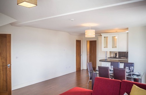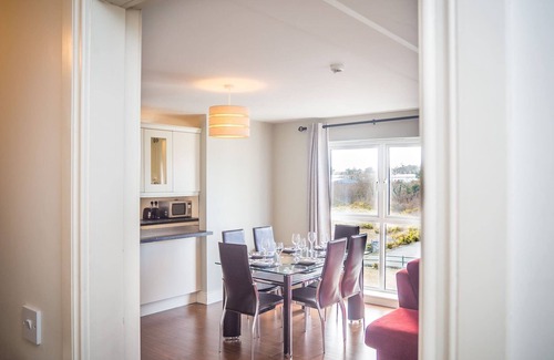 The sitting room area has a large l-shaped couch and flat-screen TV, the dining area has a dining table seating 6. The fully equipped kitchen area has a built-in large fridge freezer, induction hot, oven and separate grill oven, microwave and dishwasher.