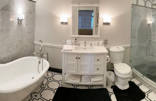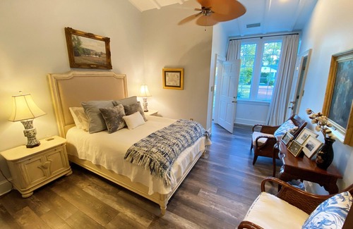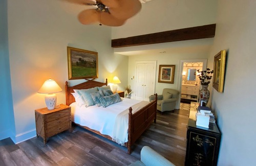 The Carriage house boasts modern comforts and charming architecture. The carriage house is rented as an entire home. Bedrooms are equipped with a private entrance, queen bed, and master bath. Pets $100