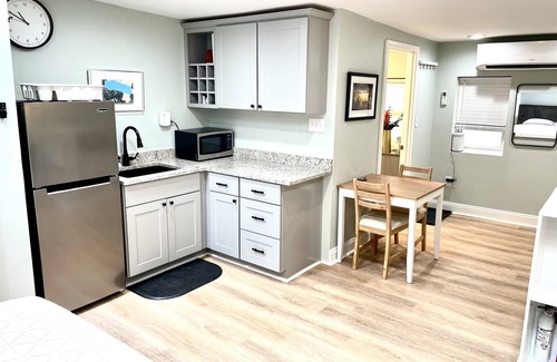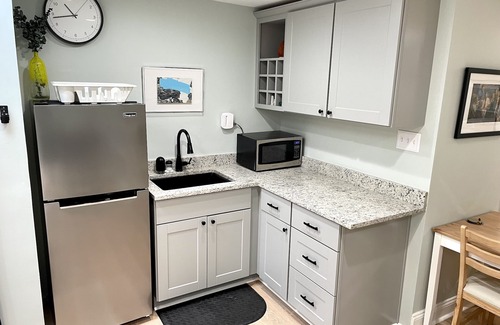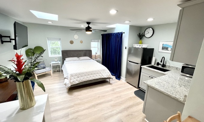 The kitchenette has a mini-fridge with freezer, microwave, hot plate, Keurig, and drip coffee maker. The studio itself has several windows, A/C, heat, a ceiling fan, ample closet space, and a combo washer & dryer. The full bathroom is in a separate room.
