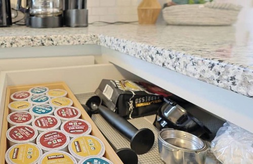 Coffee-making options include drip coffee, K-cups, and a cappuccino machine.