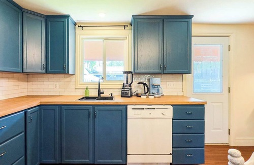 Inside, you’ll find that lake-themed style carried through every room — calming blues, cozy textures, and all the touches that make you feel instantly at home. The living area invites you to kick back in front of the Smart TV, while the dining space is perfect for board games or shared meals. The kitchen is stocked and ready whether you’re making pancakes or pasta.