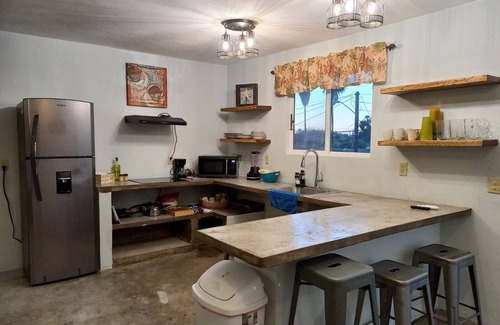 Amplio apartamento dos recamaras , un bano con un sofa cama en la sala, cuenta con estufa electrica, refrigerador, microndas, cafetera, licuadora y todo para cocinar, utensilios, platos, vasos y tasas para cafe, internet y television smart y wifi en toda la propiedad, alberca que se comparte con el resto de la propiedad y medio bano, estacionamiento exclusivo