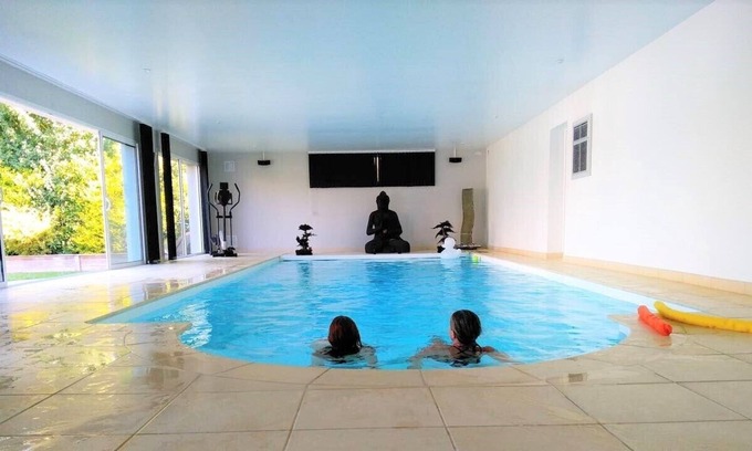 You can relax and swim in a large indoor pool (4.50 x 10 m) in a heated room of over 120 m² secure for children, 4 large bays overlooking a charming garden with a swing for children .
