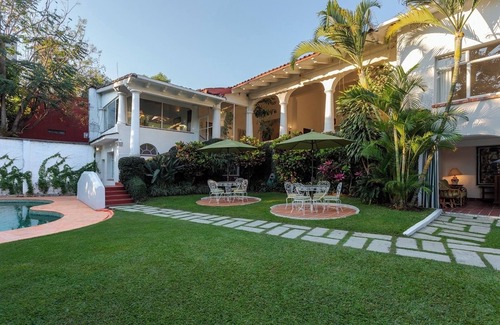 Discover a true hidden gem in the heart of Cuernavaca. This stunning Hacienda-style home offers a one-of-a-kind experience, blending elegance, comfort, and the charm of traditional Mexican architecture. Just a 5-minute walk from Las Mañanitas Hotel, this spacious retreat features a breathtaking double-height living room that opens completely to the lush garden, creating an unparalleled indoor-outdoor experience.