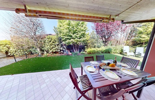 Casa Arcoiris offers a welcoming and functional stay experience, ideal for families, couples and business travelers looking for comfort and tranquility. Located in Manerba del Garda, this property is located in a natural environment surrounded by woods, ensuring privacy and serenity.The house has three bedrooms, carefully furnished with two double beds and a single bed, able to comfortably accommodate up to 5 people. The rooms are equipped with air conditioning in the living room and in the sleeping area, while electric heating ensures optimal comfort throughout the year.The house boasts two bathrooms, one with a shower and one with a bathtub, offering flexibility and comfort for guests. The independent kitchen is fully equipped with quality appliances, including a refrigerator, freezer, dishwasher, oven, coffee machine and numerous kitchen utensils that make preparing meals a pleasure.The outdoor areas are particularly well-kept, with a fenced garden of 150 square meters of synthetic grass and furnished with garden furniture, perfect for moments of relaxation outdoors. The property is pet-friendly, allowing up to two pets, and has two private parking spaces outside.Additional features include WiFi, a children's area, smoke detectors, a fire extinguisher and a cozy living area. Its strategic position allows you to easily reach the sandy beach “La Romantica” just 3 km away and a Eurospin supermarket 1 km away.An ideal accommodation for those who want to spend holidays in comfort, nature and tranquility, with all the necessary services at hand.