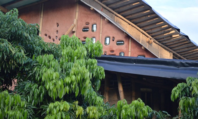 Nuestra casa de barro está construida a mano, con materiales naturales como tierra, paja, bambú y botellas de vidrio recicladas. Se encuentra rodeada de árboles frutales, en un rancho agroecológico ubicado en una zona rural, cerca de la playa (a 1.5 km) y del río (800 metros).