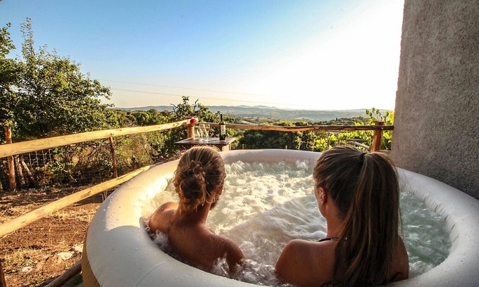 A sandy access road leads almost to the front door and the private parking in front of the house. Guests have access to a large private garden in front of the entrance, ideal for sunbathing, playing, resting, eating outside ... The property is completely fenced and therefore well suited for a holiday with pets. In addition also children can let play and have fun without danger. Something very special is the private Jacuzzi next to the house from which you have a magnificent view over the valley up to the sea. At sunset with a glass of wine… there is nothing better.