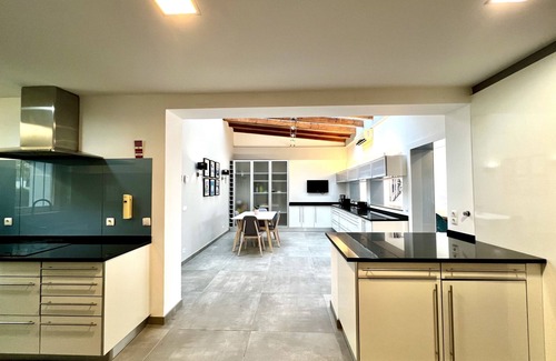 On the ground floor there is a huge fully equipped kitchen with hob and oven, microwave, fridge with freezer, dishwasher, American and Nespresso coffee machine, electric kettle, toaster and blender. The kitchen is prepared with all utensils, so you can enjoy your homemade meals.
