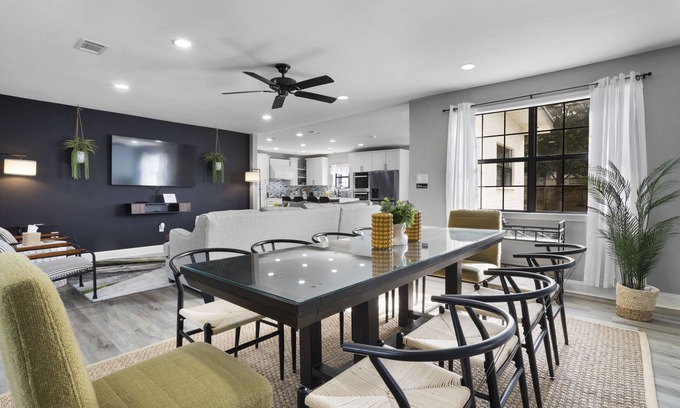 Chef's Kitchen & Dining: Host intimate dinners or buffet-style receptions in the large dining area, accommodating up to ten guests at the table, while the fully stocked chef's kitchen makes meal preparation a breeze.