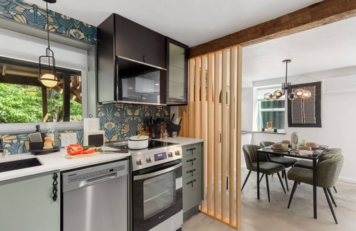 Cook dinner while admiring the back garden or check out the local fare (Backwoods Brewery is just around the corner), and then settle in outside on the patio to watch the stars. Not into nature? Enter your logins for movie night on the 50” flatscreen TV and speaker system. Streaming your favorite shows or working remotely is easy with ultra-fast internet (around 1000 mps), a full dining table, and cozy couches.