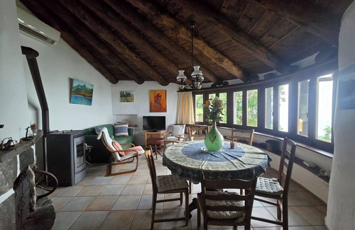 Inside, Casa Cappellina presents a spacious open-plan living arrangement, suffused with natural light thanks to numerous windows, all equipped with privacy shades. The living room features tiled floors and is furnished with a comfortable sofa corner, armchair, dining area, and an open fireplace that invites for cozy evenings. The open kitchen, accessible directly from the living area, is fully equipped with a ceramic stove, electric oven, refrigerator with freezer compartment, full cookware, tableware, dish towels, and all essential utensils for self-catering.