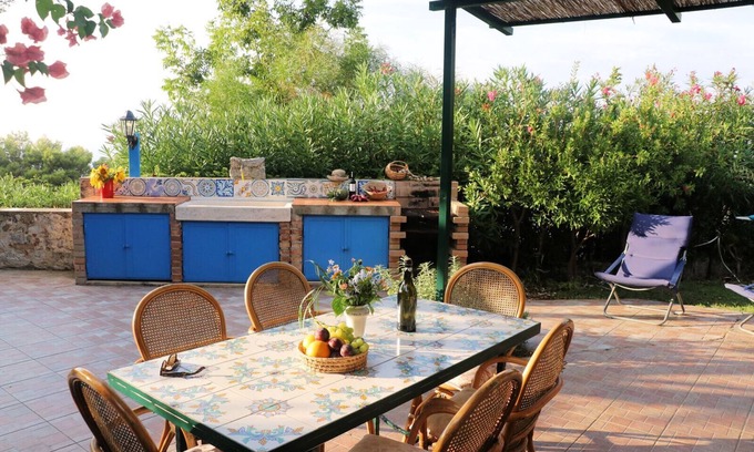 In the compound's garden, one can find many different Mediterranean plants and enjoy amazing views. There is also a private path (400 steps) that leads to one of the most beautiful bays in southern Italy. This beach is only accessible via this private path which only the guests in the complex can use or by sea. One can also take a refreshing swim in the swimming pool, shared with the other guests in the compound which has 6 holiday houses/apartments.