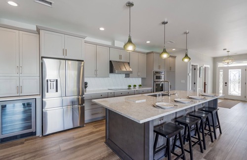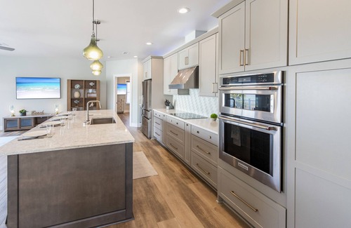 The open concept floor plan allows everyone to gather and enjoy time together, whether you’re watching TV, playing games, or simply gazing out at the tranquil waters. The high-end chef's kitchen is perfect for preparing meals or snacks, featuring gorgeous cabinetry, quartz countertops, top-of-the-line stainless steel appliances (including a wine fridge), and everything you’ll need for food prep. Dining for 4 is provided at the main table, and another 5 seats are available at the large breakfast bar.