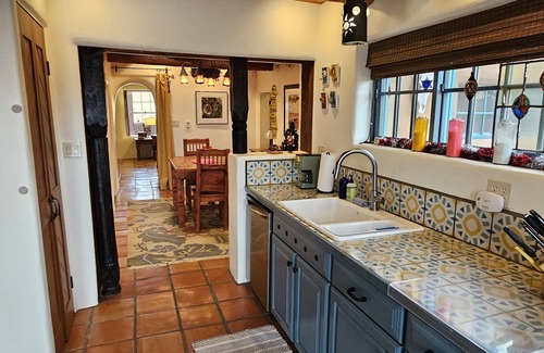 Additional architectural features include historically preserved coved and viga ceilings throughout, a gas kiva fireplace, custom ironwork, vintage Spanish Colonial lighting, radiant heated Saltillo tile floors, 3 foot thick 200 year old adobe walls, vintage and historical doors, and custom made cement tilework from San Luis Potosi, Mexico in the kitchen and bathroom.