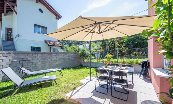Nestled in a sun-dappled locale with lush greenery around, this hillside house in Losone is ideal to disconnect from the fast pace of cosmopolitan cities and indulge in the easy-going life of Mediterranean Losone, Ascona. The sun-filled getaway has a soothing blend of natural tones, spacious interiors and minimalist decor for a relaxed space to unwind; the living room has one large and plush sofa, a Smart TV, and indoor wooden dining for eating-in moods. The room also directly leads out onto the private garden with alfresco dining.