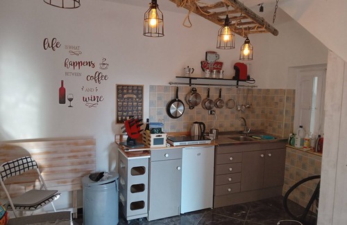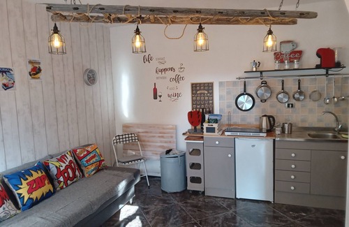 Inside downstairs is one room. I has a comfortable sofa bed, easy chairs and fold out dinning is a kitchen unit with a double induction hob, microwave/grill, fridge, coffè machine, kettle, and pots pans etc.