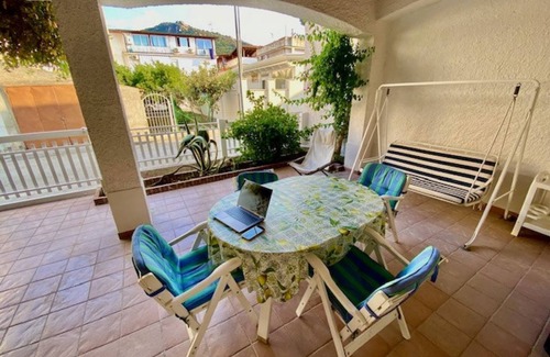 On the ground floor there is a kitchen with washing machine, a large living room with a single sofa bed and a bathroom. You enter the large covered patio, furnished with table, chairs and swing, in the corner of which there is a shower, ideal when returning from the sea.