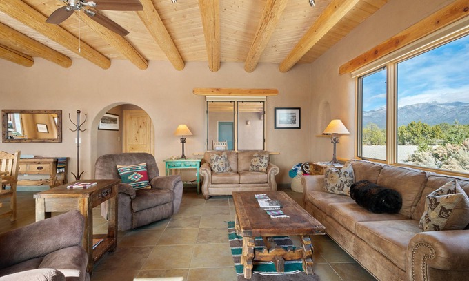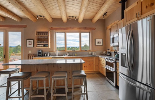 Gorgeous custom features and traditional design are found throughout this 2,500 square foot upscale property with amazing mountain views, including a kiva fireplace and traditional viga ceilings. The chef in your group will love the gourmet kitchen.